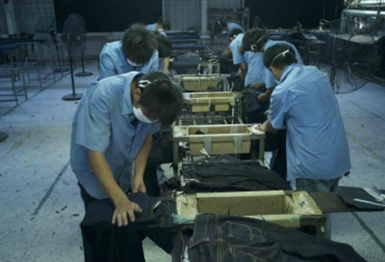 3.磨邊 磨爛 勾紗 將衣物在洗水前,人為地將褲腳,褲頭等一些特定部位用銳器刮爛,從而制成洗后的破爛懷舊效果 4.打搶.手針 用線將牛褲某些部位縫起,凸出的部位由于在洗水過(guò)程中受的的摩擦較多,從而掉色較嚴(yán)重,水洗效果也較明顯,而凹入的部位在洗水過(guò)程中受的的摩擦較少,從而掉色較輕,水洗效果不明顯。同沒(méi)做手針的其它部位形成深中淺的三種洗水效果 5.立體貓須 將衣物浸免燙樹(shù)脂并脫水后,在特定部位用夾子夾出需要的形狀,起伏度,然后再高溫烘焙,讓樹(shù)脂交聯(lián)定型,從而制出永久的立體褶皺效果 6.噴砂 是在洗水前,通過(guò)使用一些表面粗糙的物質(zhì)(如硼砂),通過(guò)噴槍在一定的氣壓作用下使沙打擊并摩擦布面而達(dá)到褪色的效果,噴砂的地方經(jīng)洗水后顯得較為自然地懷舊和泛白,給人較強(qiáng)隨意感 7.扎花 扎洗是在洗水的過(guò)程中將衣物以繩子等東西全部或局部扎起來(lái)后洗水,以達(dá)到洗后布面呈現(xiàn)隨意的深淺色對(duì)比,有浮云般的效果(類似扎染 8.馬騮 噴一些氧化劑,一般是高錳酸鉀溶液,讓衣物局部褪色,從而讓牛褲顯得自然地懷舊和泛白 9.噴色 抹色 將衣物在洗水后,用人手將涂料或者直接料涂抹或者噴灑在衣物表面,制作懷舊效果